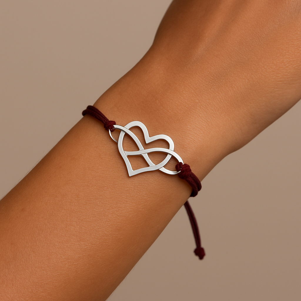 Bracciale infinito e cuore intrecciati in argento con cordino in microfibra